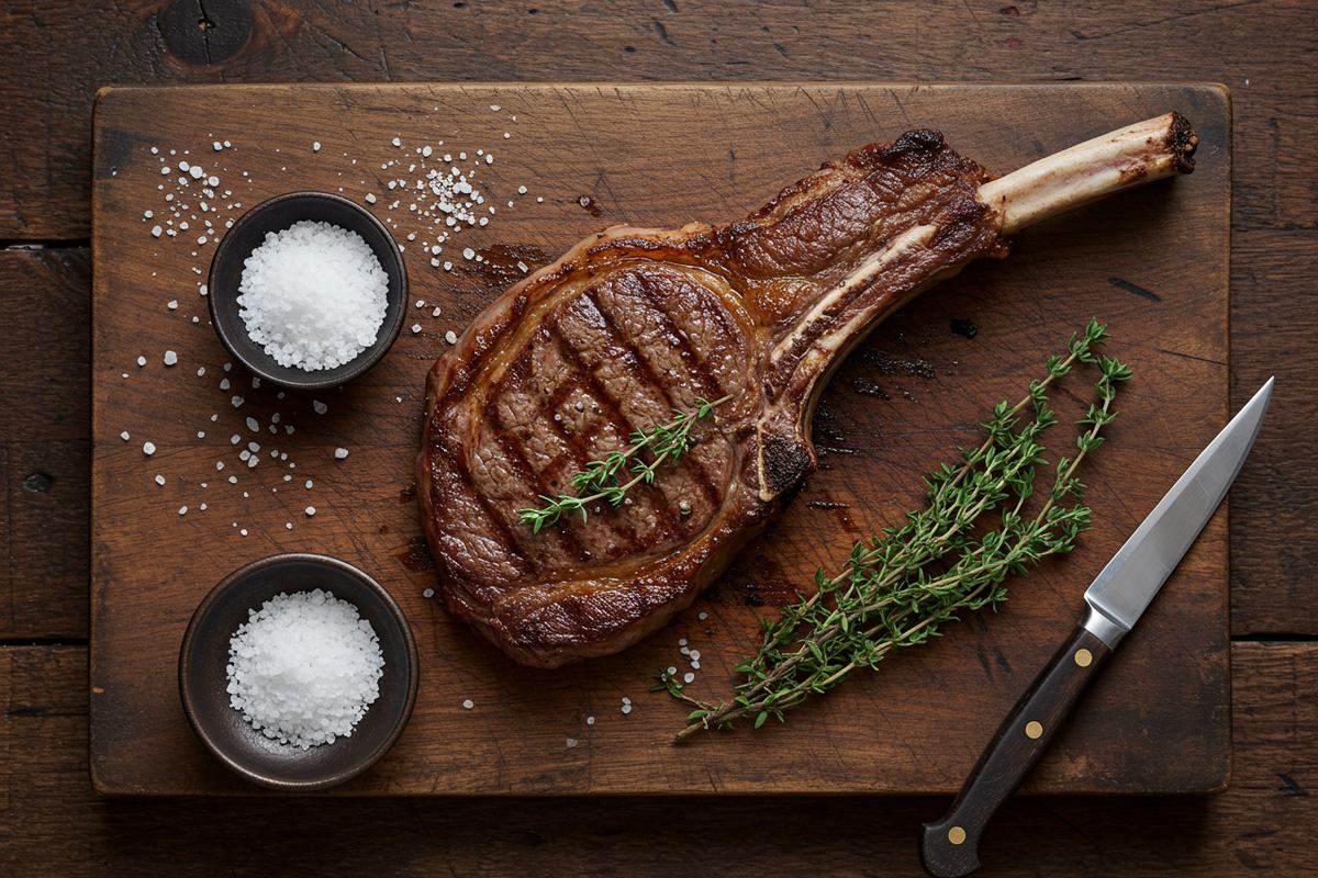 Dry-brine the ribeyes 45 minutes ahead: salt aggressively, leave on a wire rack at room temp. The salt first draws moisture out, then pulls it back in along with the seasoning.
