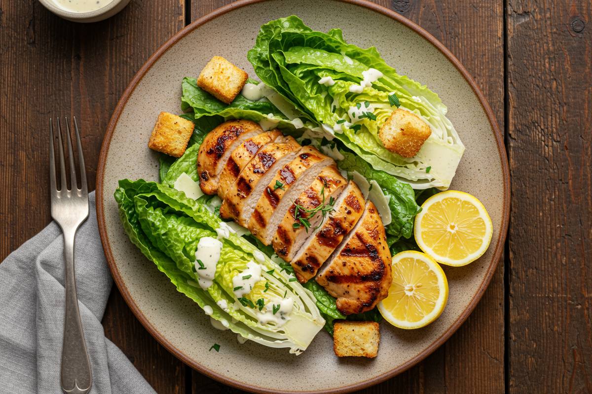 Slice the chicken. Plate the romaine, drizzle with Caesar, top with chicken, Parmesan, and grilled-bread croutons.